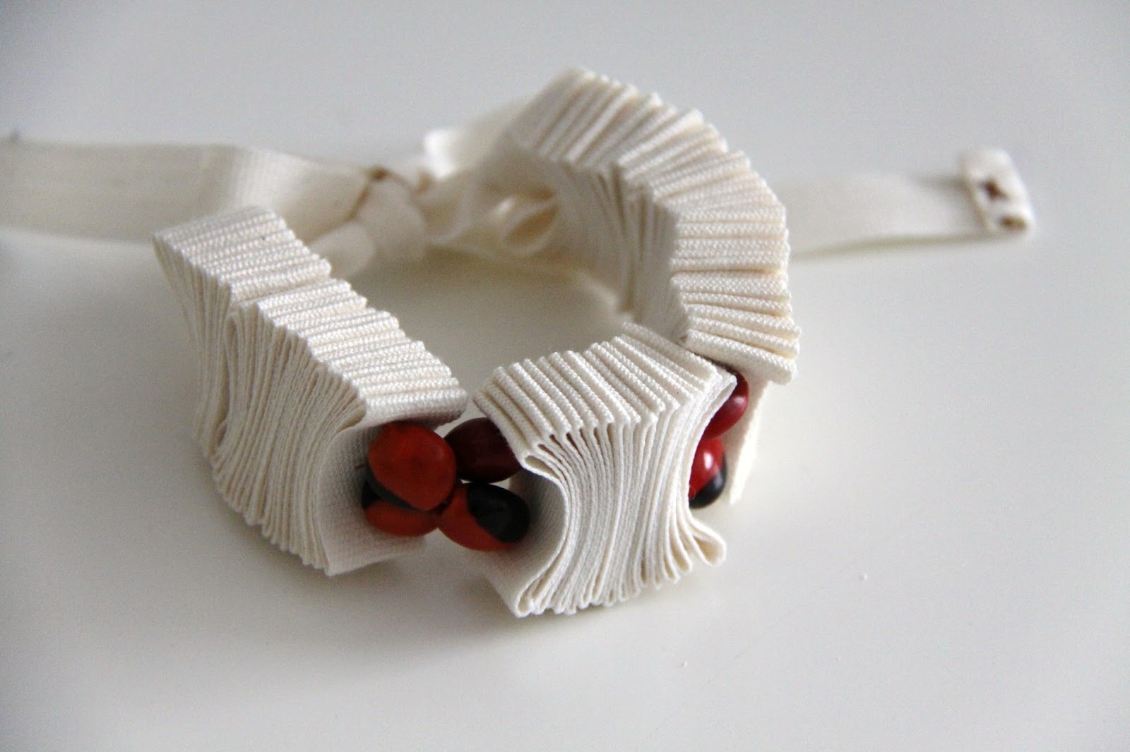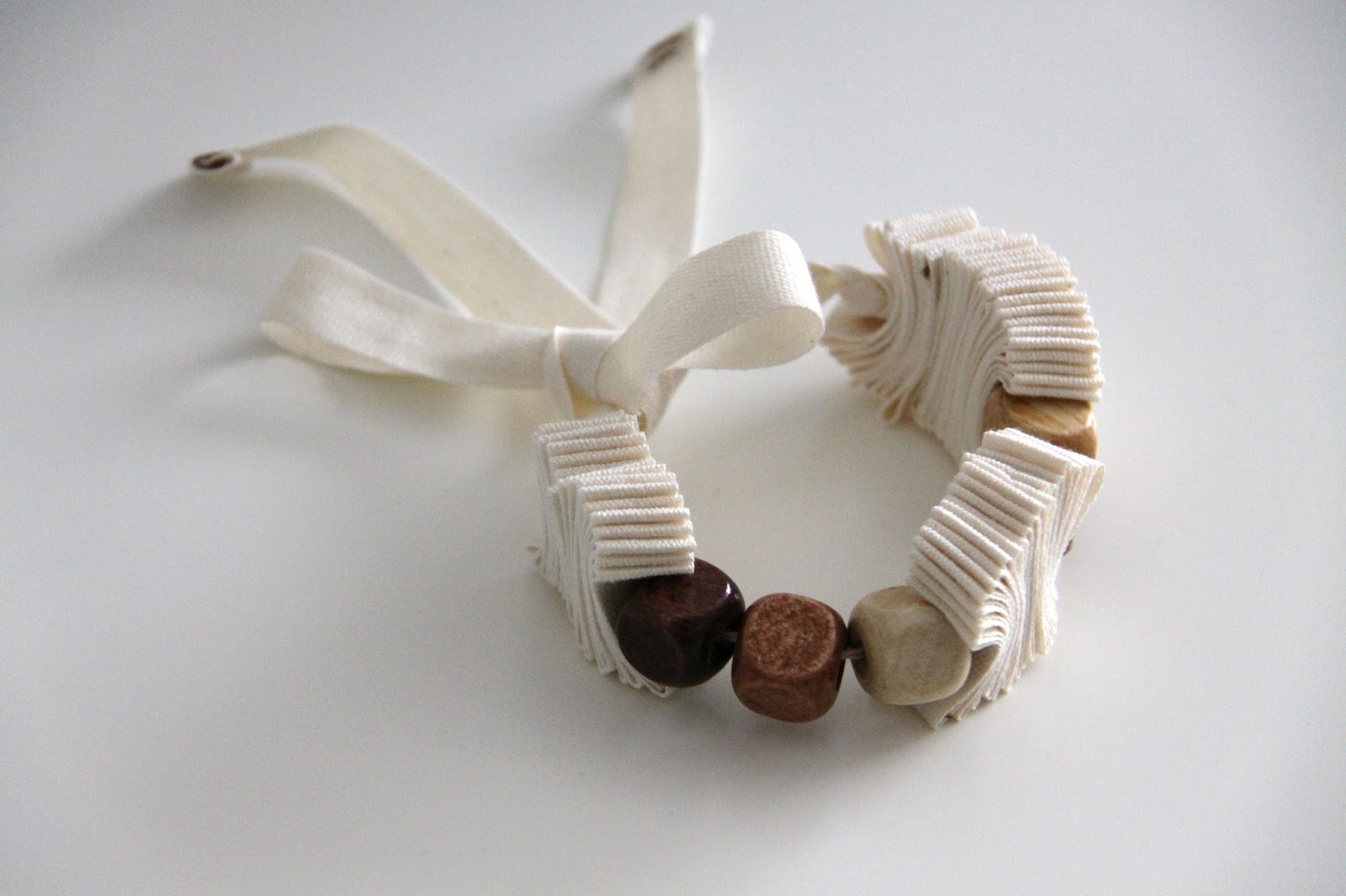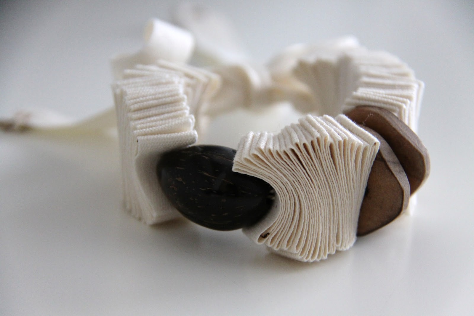Los pliegues continúan siendo la base, y ahora he utilizado cintas de algodón, en color natural, verde y marrón.