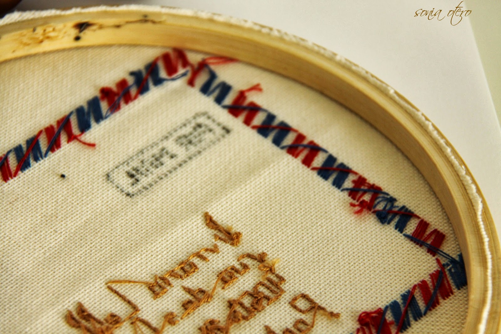 Así que siguiendo un poco la estela de mis rincones de lectura, como éste, he bordado un sobre que irá vía air mail, a una preciosa librería en Oporto, en la que no me canso de recorrer sus pasillos, subir sus escaleras y curiosear entre todos sus ejemplares, ¡una delicia!